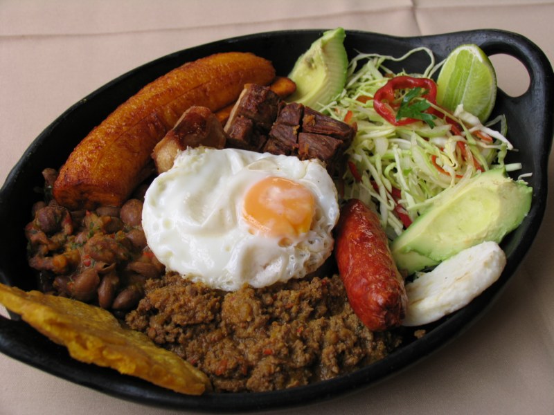 Lo tradicional para comer en Medellin es la bandeja paisa que consiste de una fuente de gran variedad de alimentos como carne, aguacate, papa, pollo, chorizo, huevo, frejoles, etc.